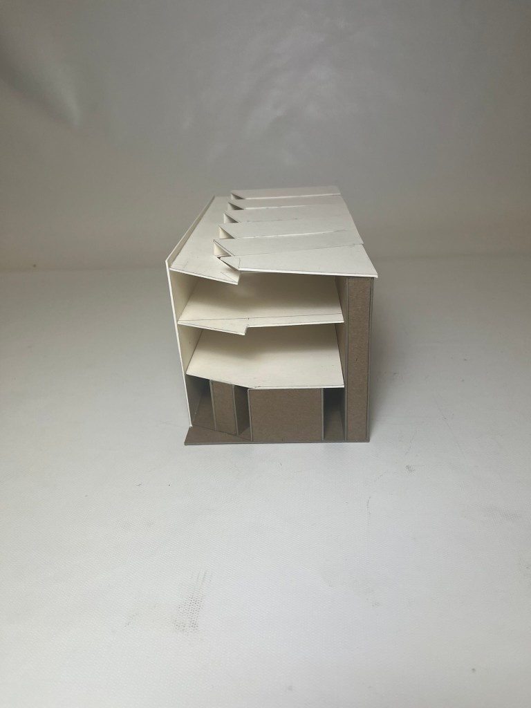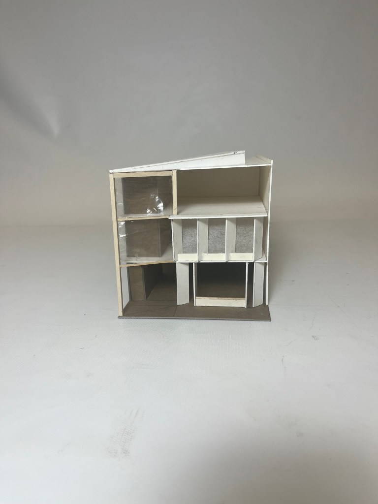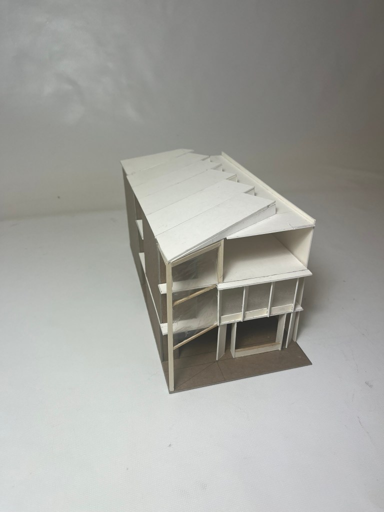 Powelton Village is a neighborhood in Philadelphia that includes Drexel University. It is a community of academics, students, artists, musicians and creative individuals. Warehouse space on Lancaster Avenue includes art spaces, dance groups, coffee shops and row houses. The Powelton Village Rowhouse project requirements is to design a row house that covers two empty lots on Lancaster Avenue. The design in progress includes elements that allow for natural light and cross ventilation. The diagonal roof and facade is designed to control light and provide privacy.